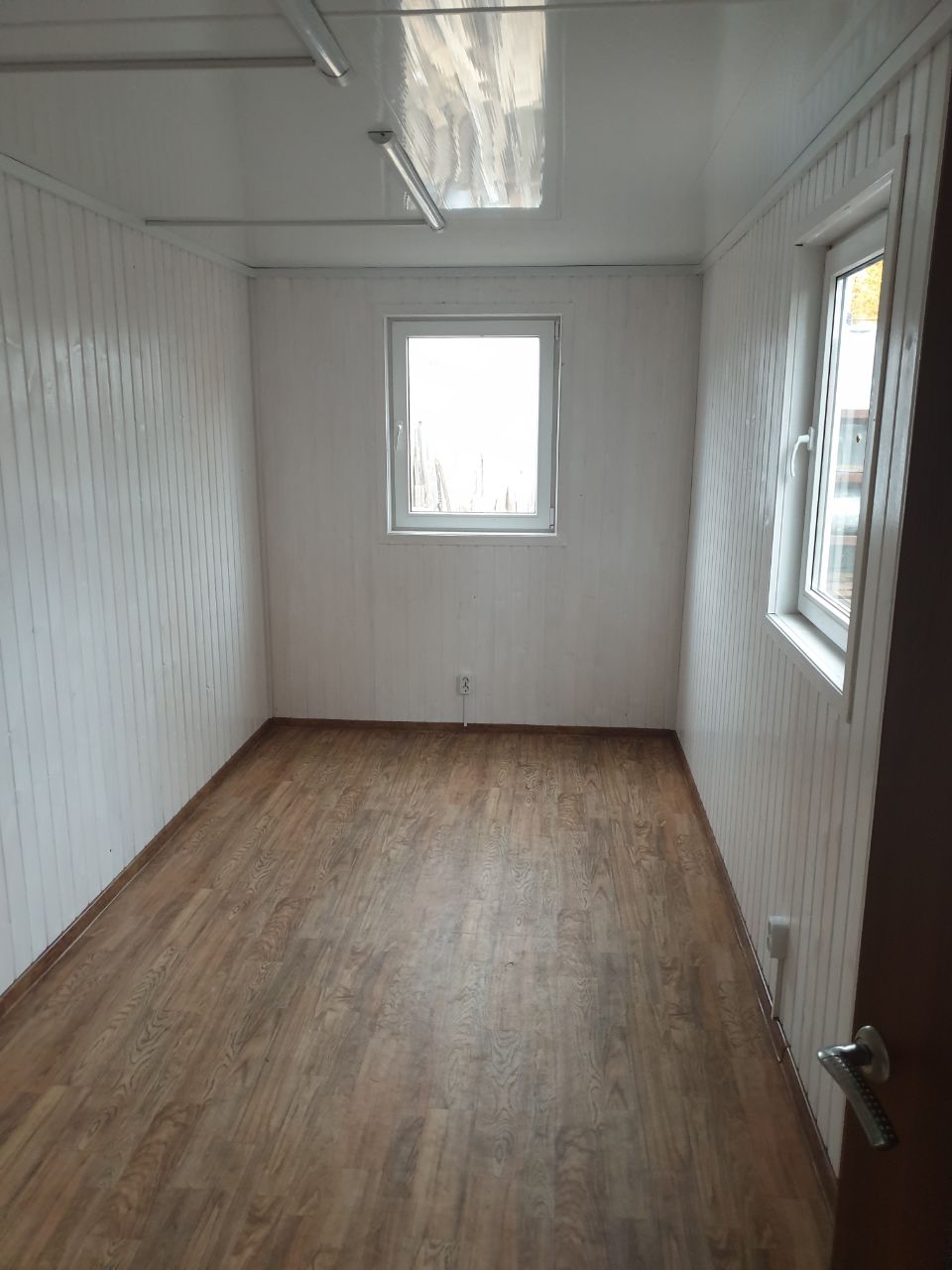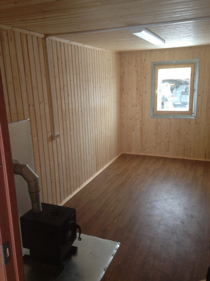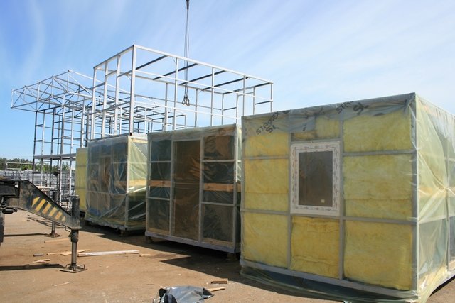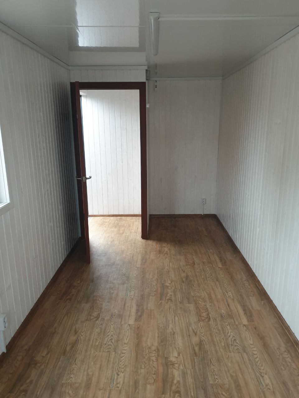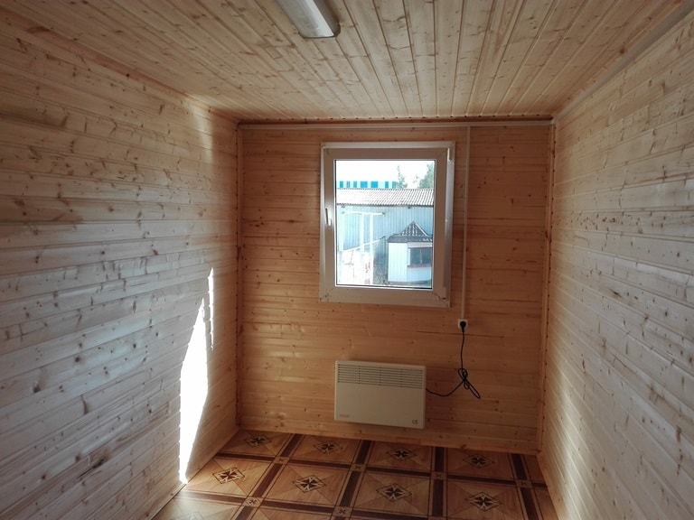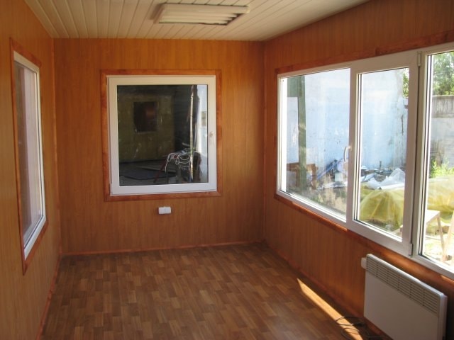 Модуль имеет утепленный пол, деревянные оконные рамы с двойным остеклением, входную дверь, обшитую металлическим листом, полностью сварной каркас из металла, жесткие углы рамы.